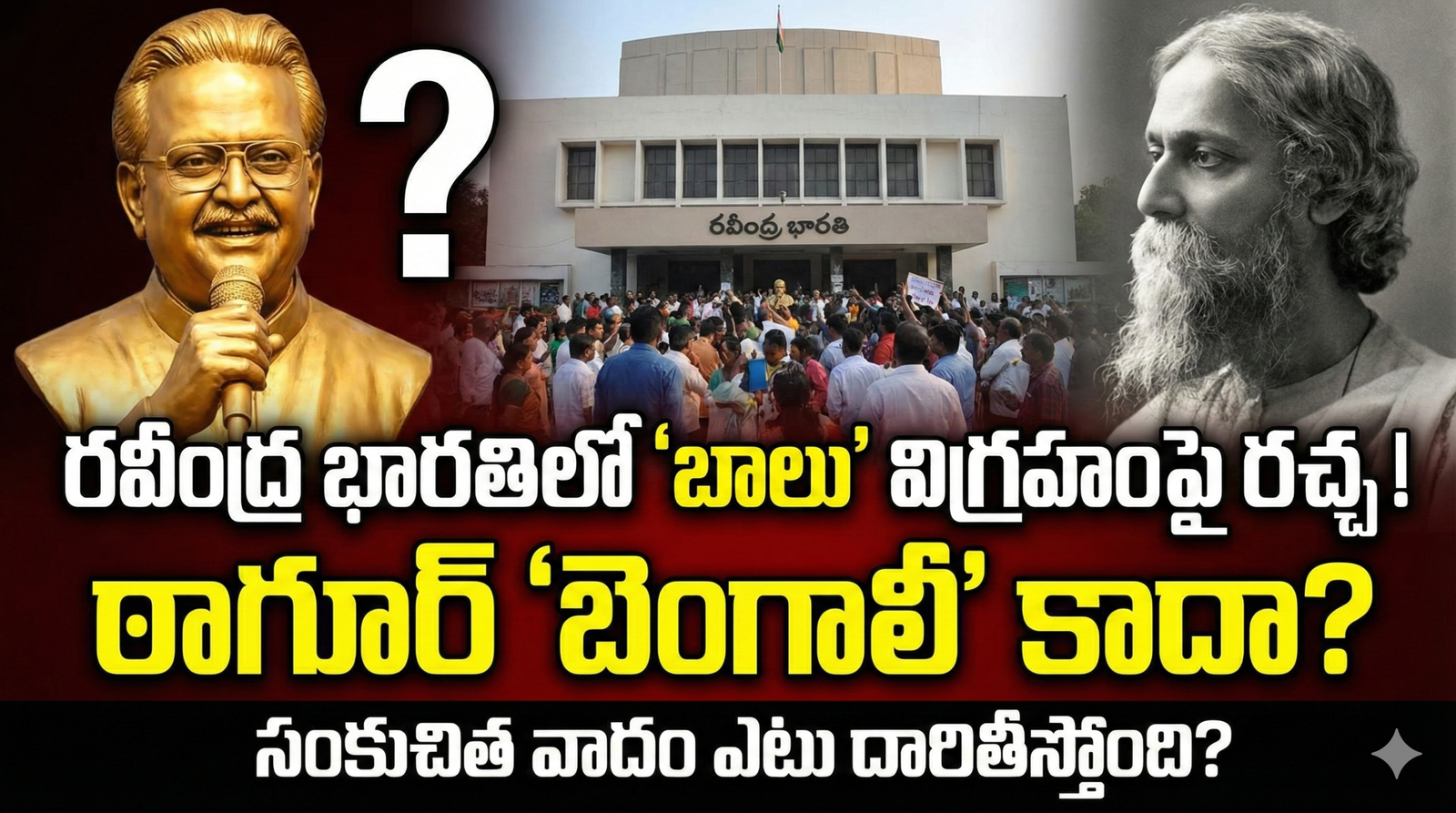 ‘రవీంద్రనాథ్ ఠాగూర్’ (Rabindranath Tagore). ఆయనది తెలంగాణ కాదు, ఆంధ్రా కాదు, కనీసం దక్షిణాది కూడా కాదు. ఆయనది పశ్చిమ బెంగాల్. ఒక బెంగాలీ (Bengali) కవి పేరుతో ఉన్న భవనంలో, తెలుగు జాతి గర్వించదగ్గ గాయకుడి విగ్రహం పెట్టడానికి అభ్యంతరం ఎందుకు? విశ్వకవి రవీంద్రుడిని మనం గౌరవించుకుని నెత్తికెత్తుకున్నప్పుడు, మన భాషలోనే వేల పాటలు పాడి, మన సంస్కృతిని దశదిశలా వ్యాపించేలా చేసిన బాలును పరాయి వాడిగా ఎలా చూడగలం? ఒకవేళ ప్రాంతీయ వాదమే పరమావధి అయితే, ముందుగా రవీంద్ర భారతి పేరును మార్చి, ఏదైనా తెలంగాణ కవి పేరు పెట్టమని డిమాండ్ చేయాలి కదా? ఆ పని చేయకుండా, కేవలం బాలు విగ్రహాన్ని అడ్డుకోవడం ద్వంద్వ వైఖరికి నిదర్శనం కాక మరేమిటి?